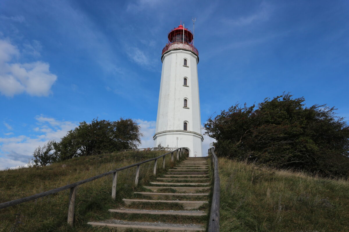 Wir radelten noch etwas weiter nördlich. Um zum Leuchtturm Dornbusch zu gelangen, muss man an einer Abzweigung sein Rad stehen lassen und darf nur zu Fuß weiter. Es geht noch ein bisschen den Berg hinauf und Hiddensee ist dort sogar recht hügelig. Um den Leuchtturm hinaufzusteigen, muss man 3,00€ bezahlen. Da Kinder unter 6 Jahren keinen Zutritt haben, genossen wir die Aussicht vom Berghügel auf die Ostsee und das benachbarte Rügen.