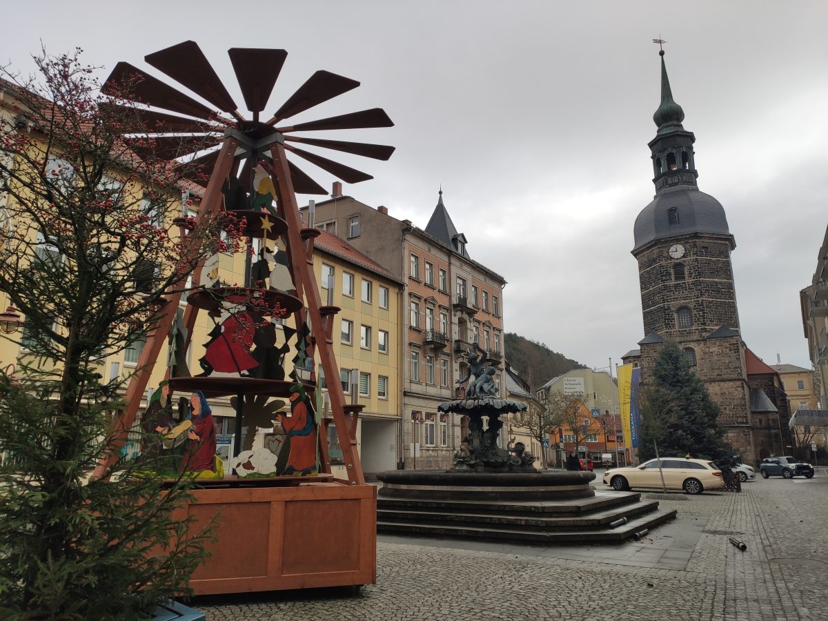 Im weihnachtlich geschmückten Bad Schandau bestaunten wir eine große Pyramide, Nussknacker und geschmückte Fenster.