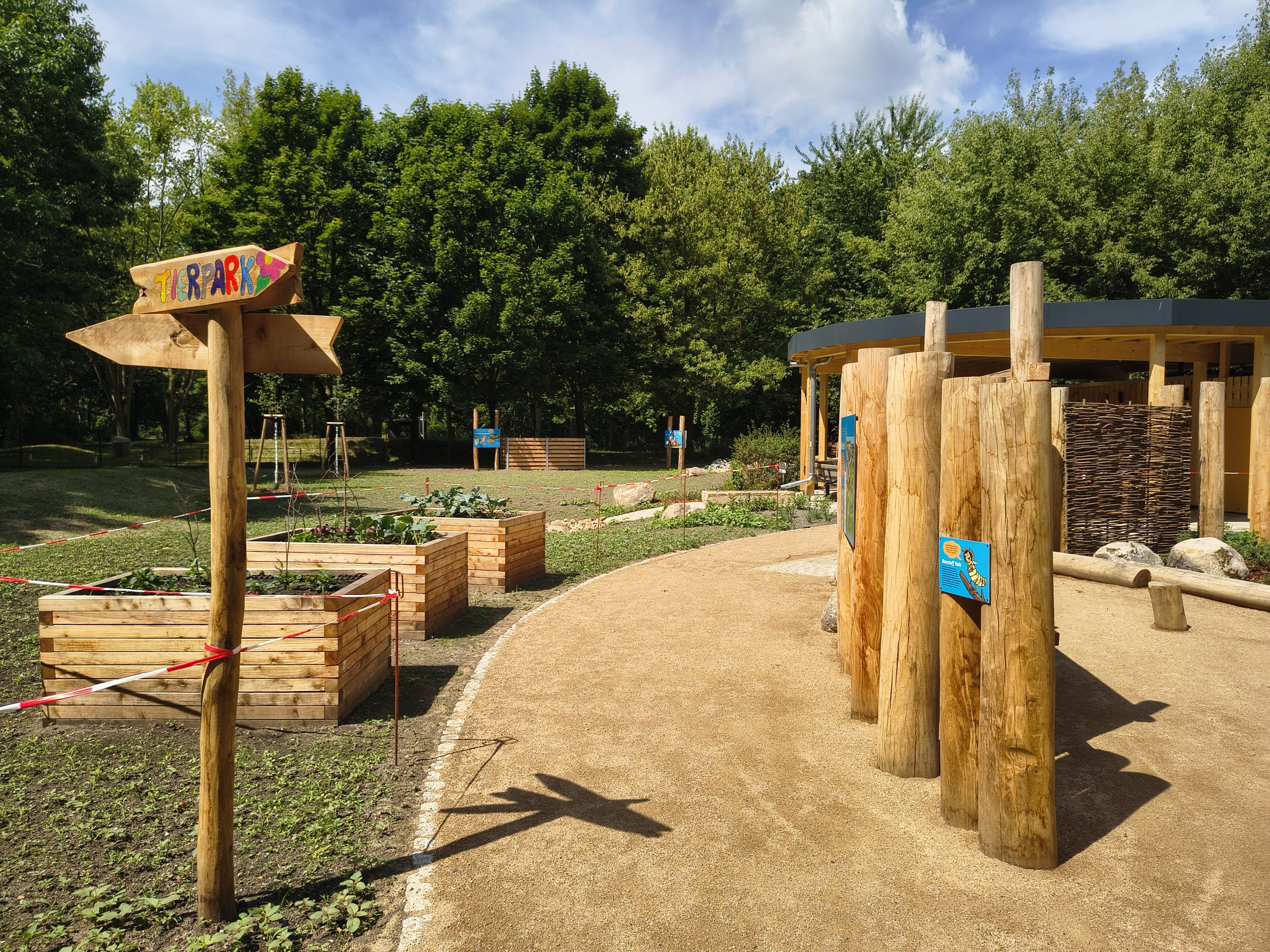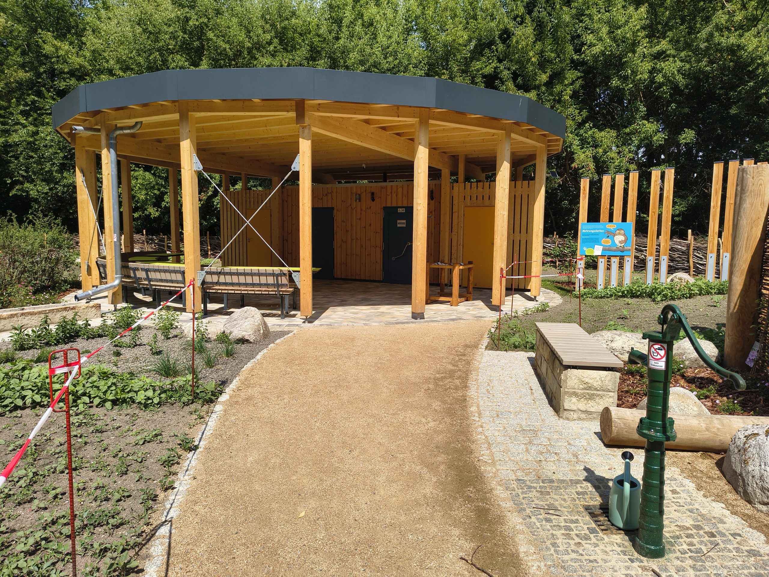 Es gibt einen sonnengeschützten Sandkasten, einen Wasserlauf, der jedoch nicht immer in Betrieb ist. Viele kleine Elemente verschönern den Spielplatz. Es gibt eine Schaukel und einen Barfußpfad. Niedlich zum Spielen ist ein relativ großes Pilzhaus. Das Areal ist groß und die Kinder können dort von Zäunen umgeben sicher spielen.