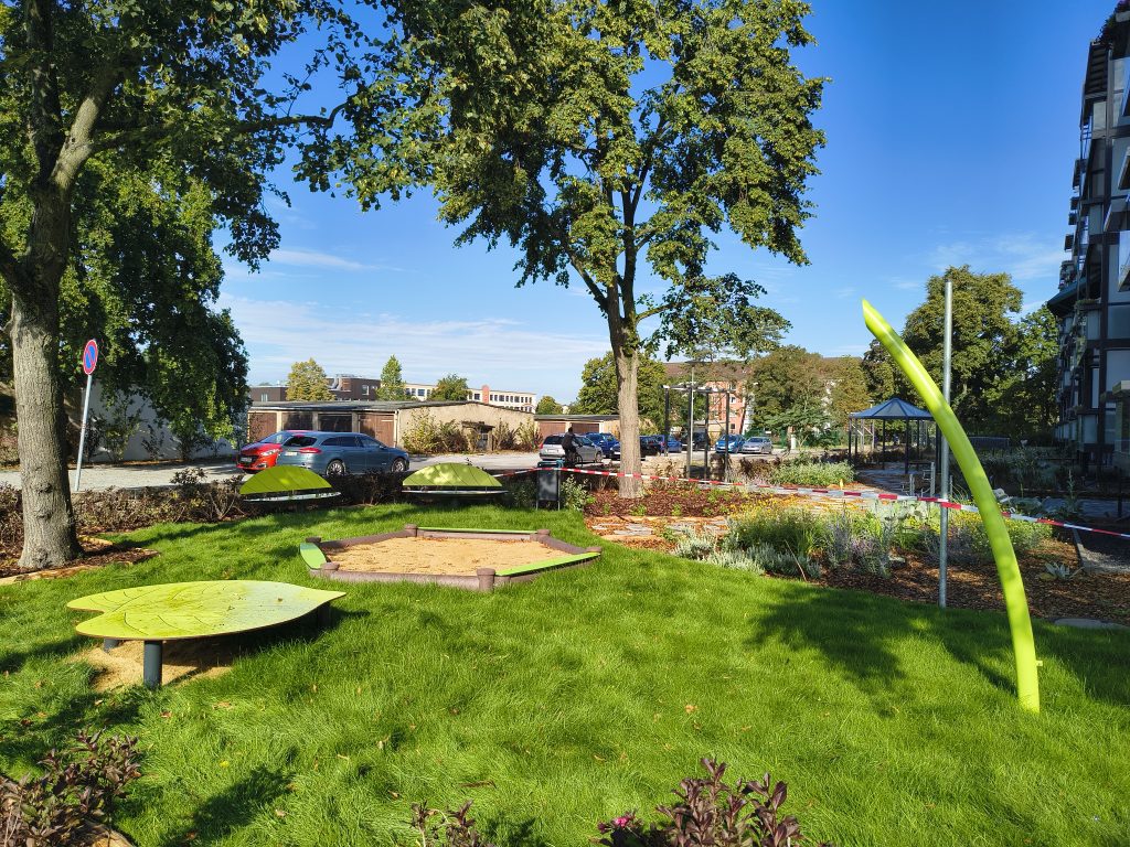 Ein kleiner Spielplatz mit Sandkasten und Balancierelement befindet sich zwischen der Johannes-R.-Becher-Straße und der Briesker Straße. Es gibt zwei Bänke zum Ausruhen.