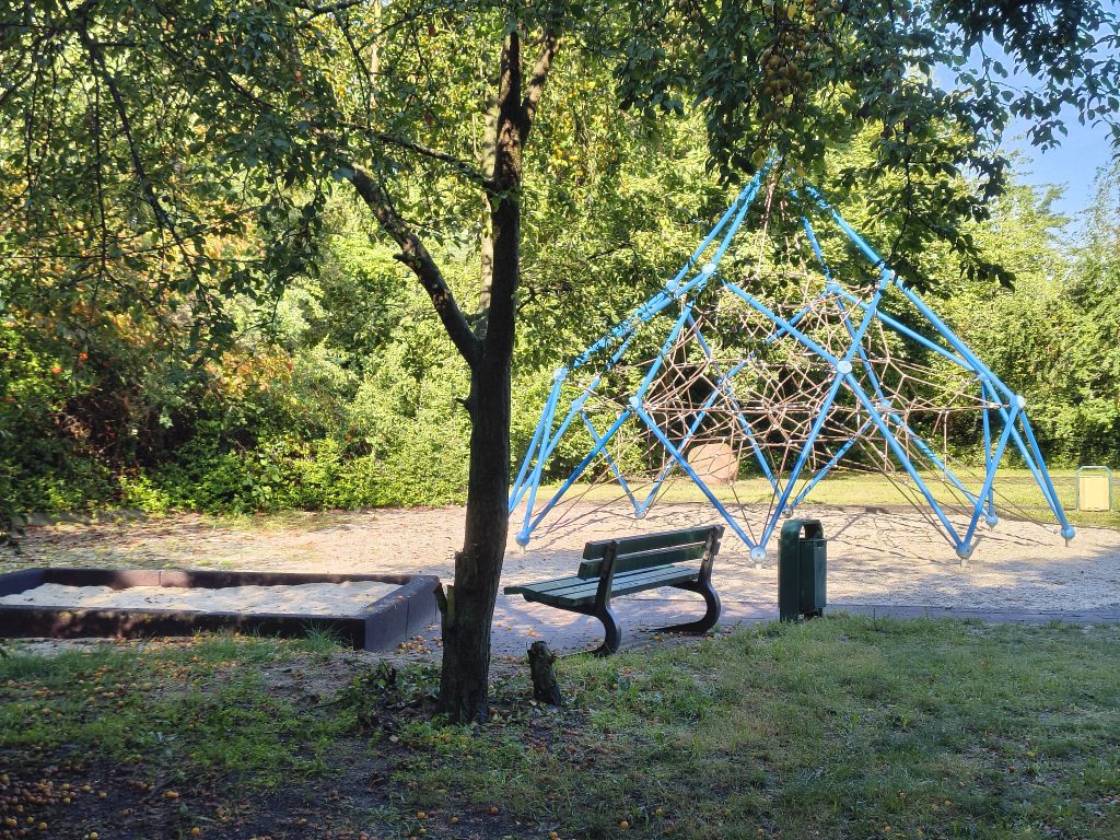 Von einem Wohngebiet umgeben, inmitten einer großen Grünfläche mit Sträuchern, Büschen und Bäumen, die allerhand Spielmöglichkeiten bieten, liegt dieser Spielplatz. Es gibt zwei Schaukeln, ein Klettergerüst mit einer Rutsche und Kletterwand, eine Wippe, Sandkasten und eine Tafel, um mit Kreide zu malen.