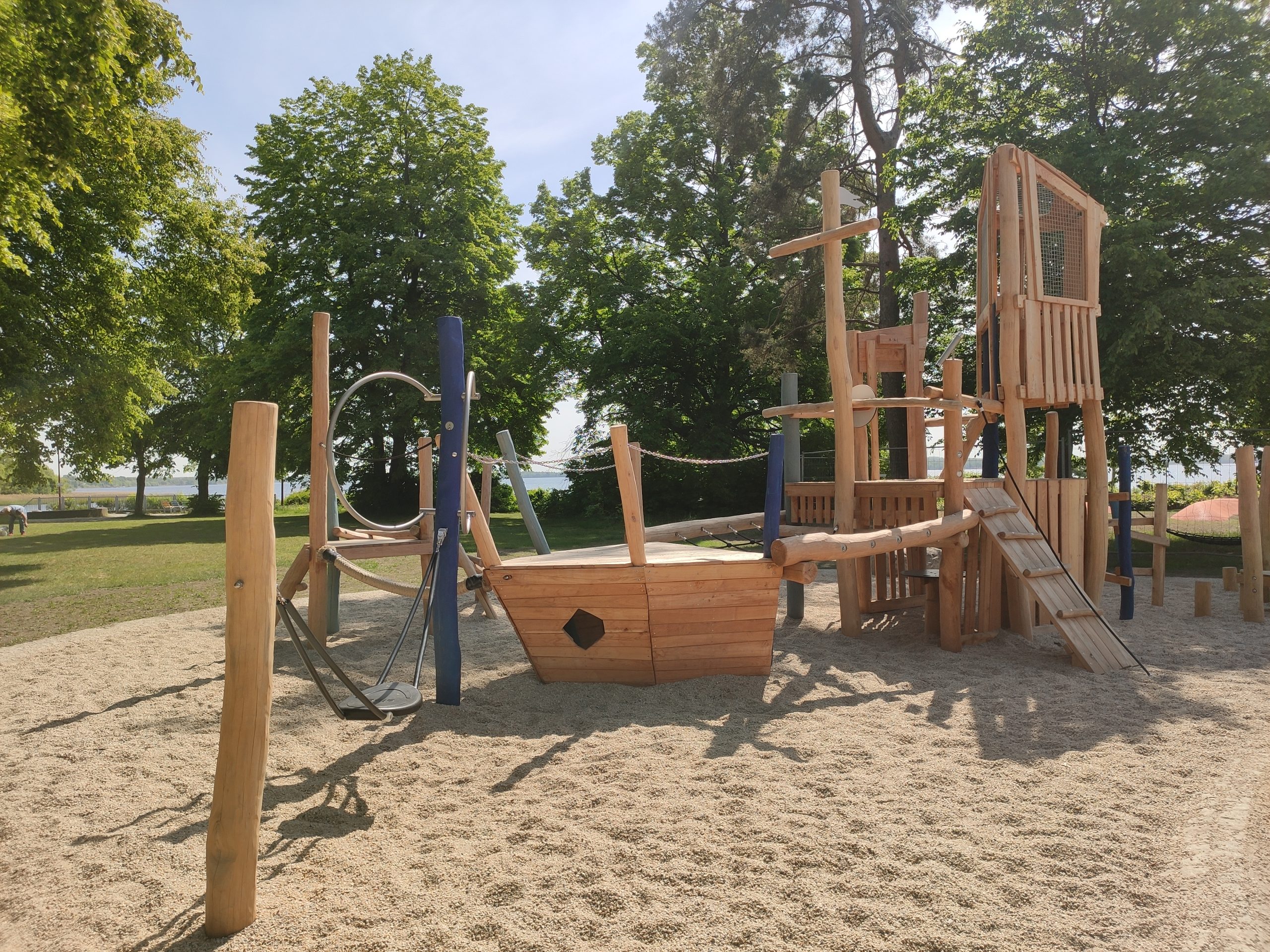 Der Schiffspielplatz befindet sich neben einem Restaurant mit Eiscafé, direkt am See. Der Radweg verläuft ebenfalls direkt daneben. Der Spielplatz ist bei Einheimischen, wie Touristen gleichermaßen beliebt. Es gibt ein großes Schiff, welches zum kreativen Spielen einlädt. Ein Steuerrad, einen Schiffsmast und Möglichkeiten zum Verstecken unter dem Schiff bieten viel Spielspaß.