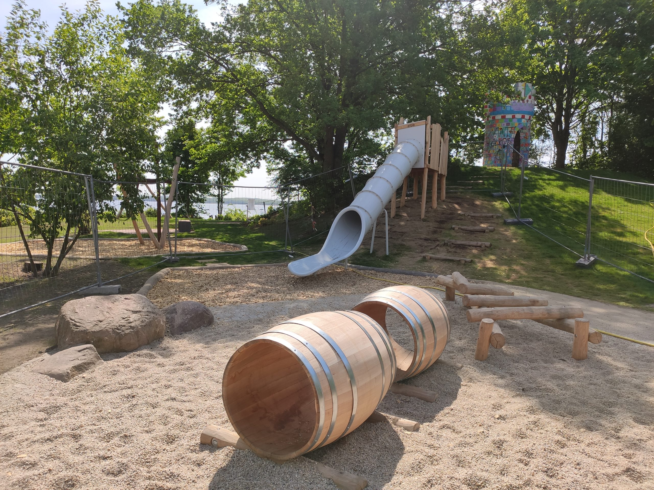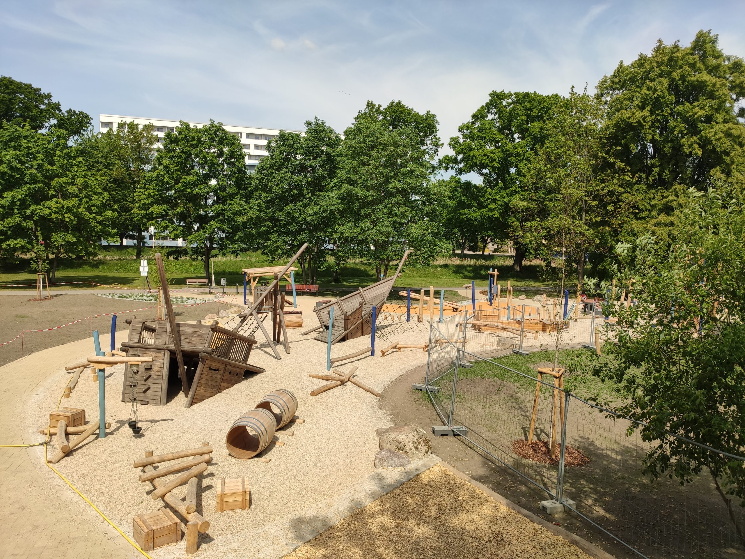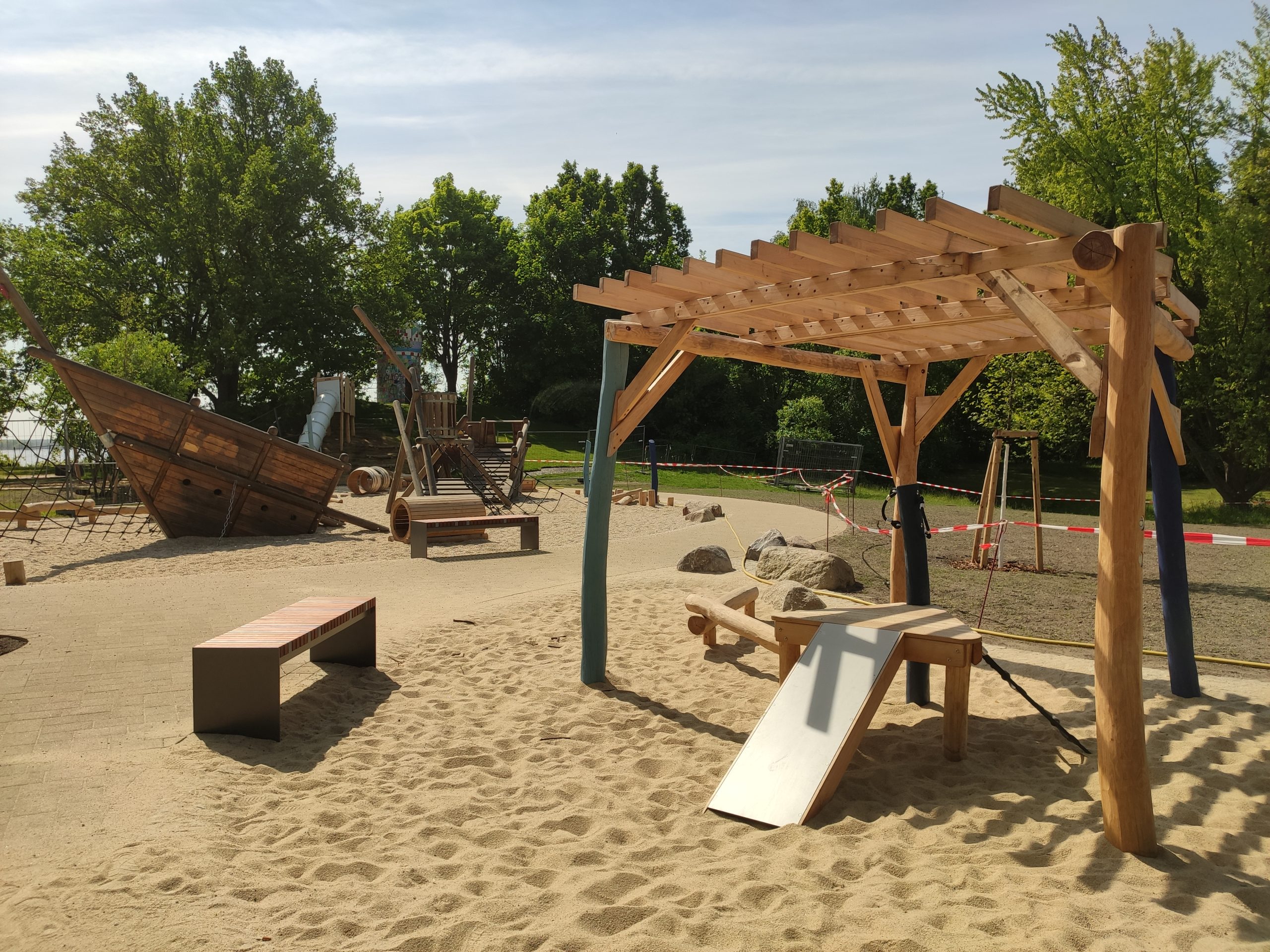 Es gibt eine Rutsche, eine Zipline, ganz viele Kletter- und Balanciermöglichkeiten, Fässer, ein integratives Beiboot, eine integrative Wippe und ein weiteres großes Bott zum Erklimmen. Zusätzlich gibt es einen Kleinkind Bereich mit Sandkästen, Rutsche. Es gibt auch viele Möglichkeiten den Sand oder die Steine zu befördern und zu bewegen.