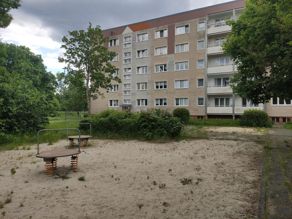 Weiter südlich, ebenfalls an der Wilhelm-Pieck-Straße ist ein Sandkasten mit zwei Wackeltieren.