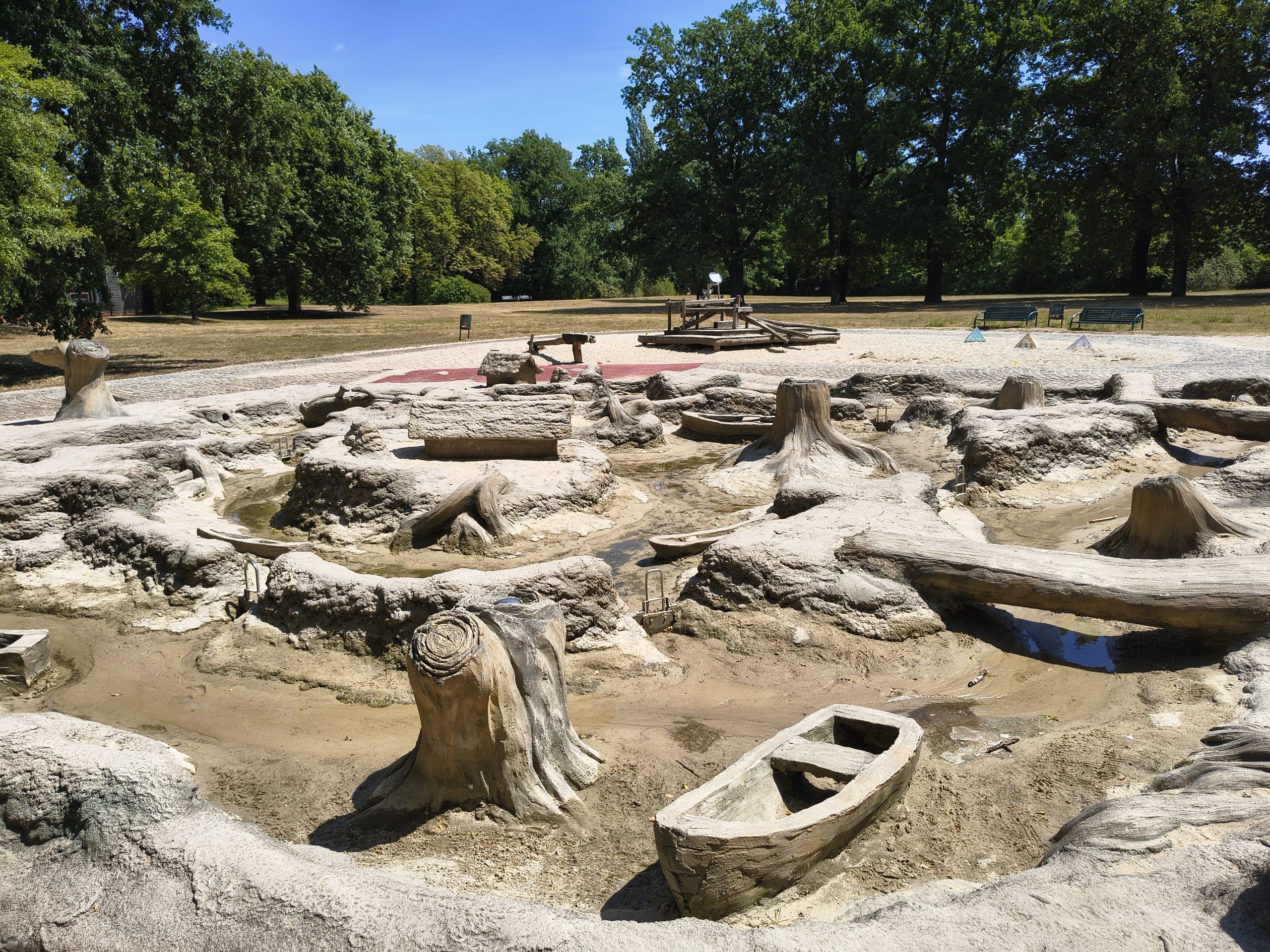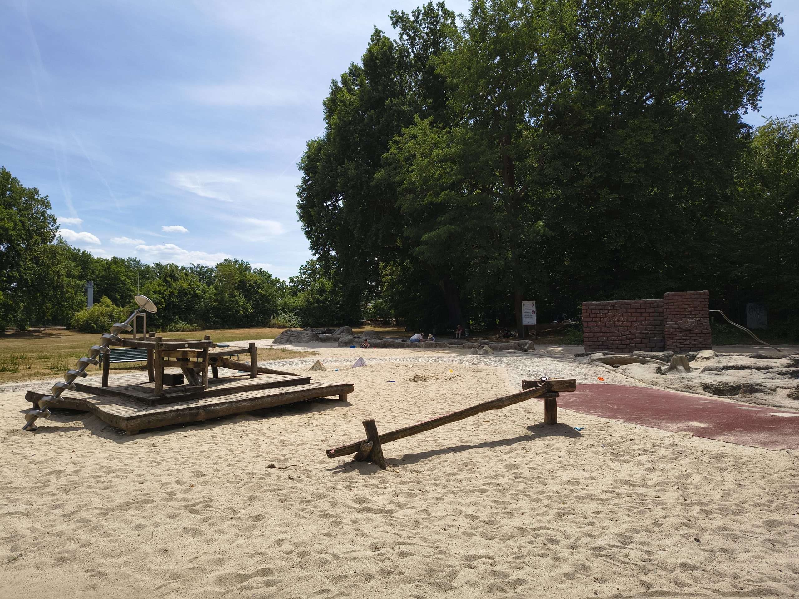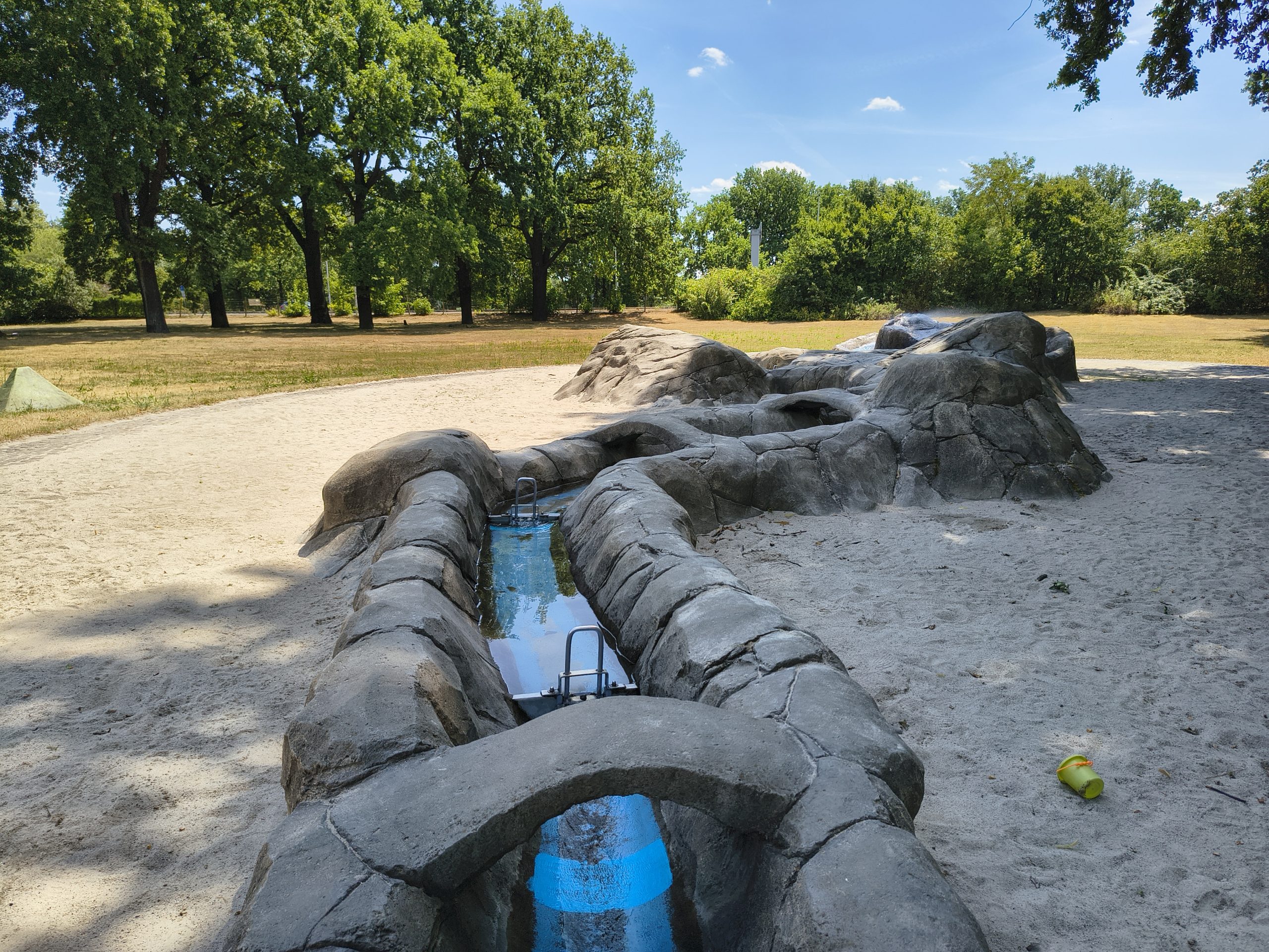 Im Eliaspark gibt es einen schönen Wasserspielplatz. Wir waren schon einmal dort und haben hier berichtet. Dargestellt wird der Flusslauf der Spree, von der Mündung bis in den Spreewald. Es lässt sich wunderbar klettern auf der Wasserspielplatzkonstruktion. Ein Sandspielplatz liegt direkt daneben. Große Bäume spenden ausreichend Schatten.