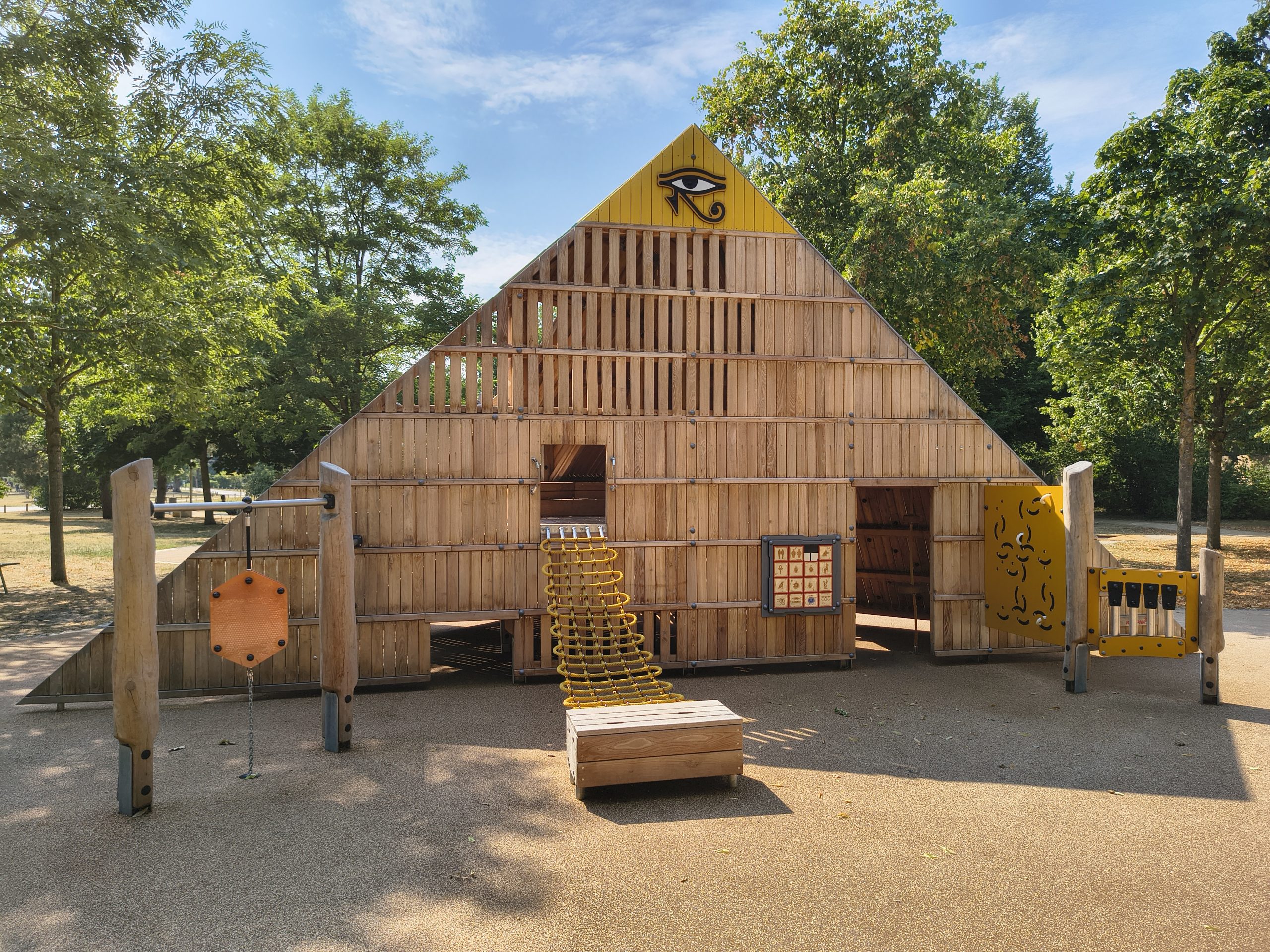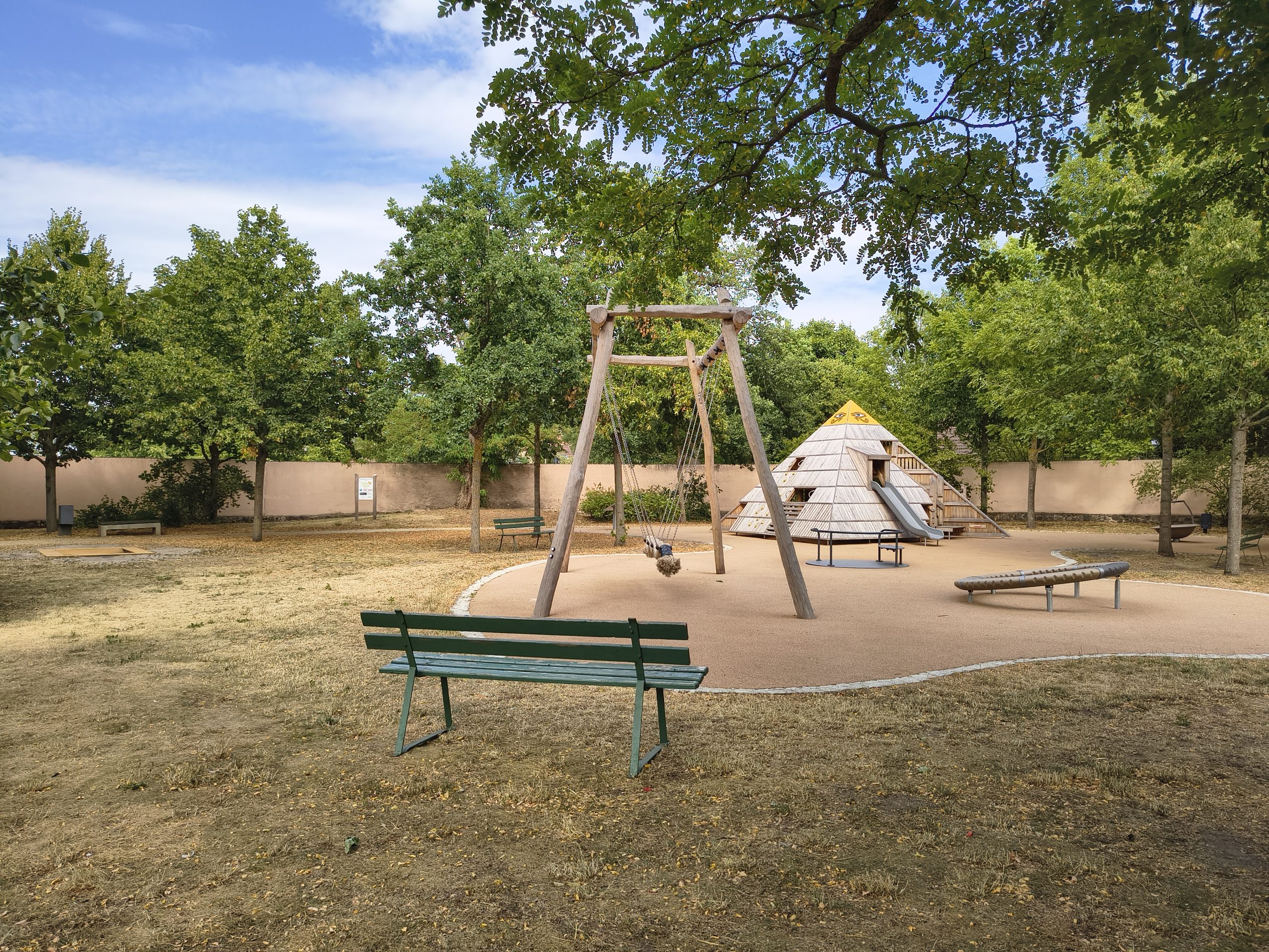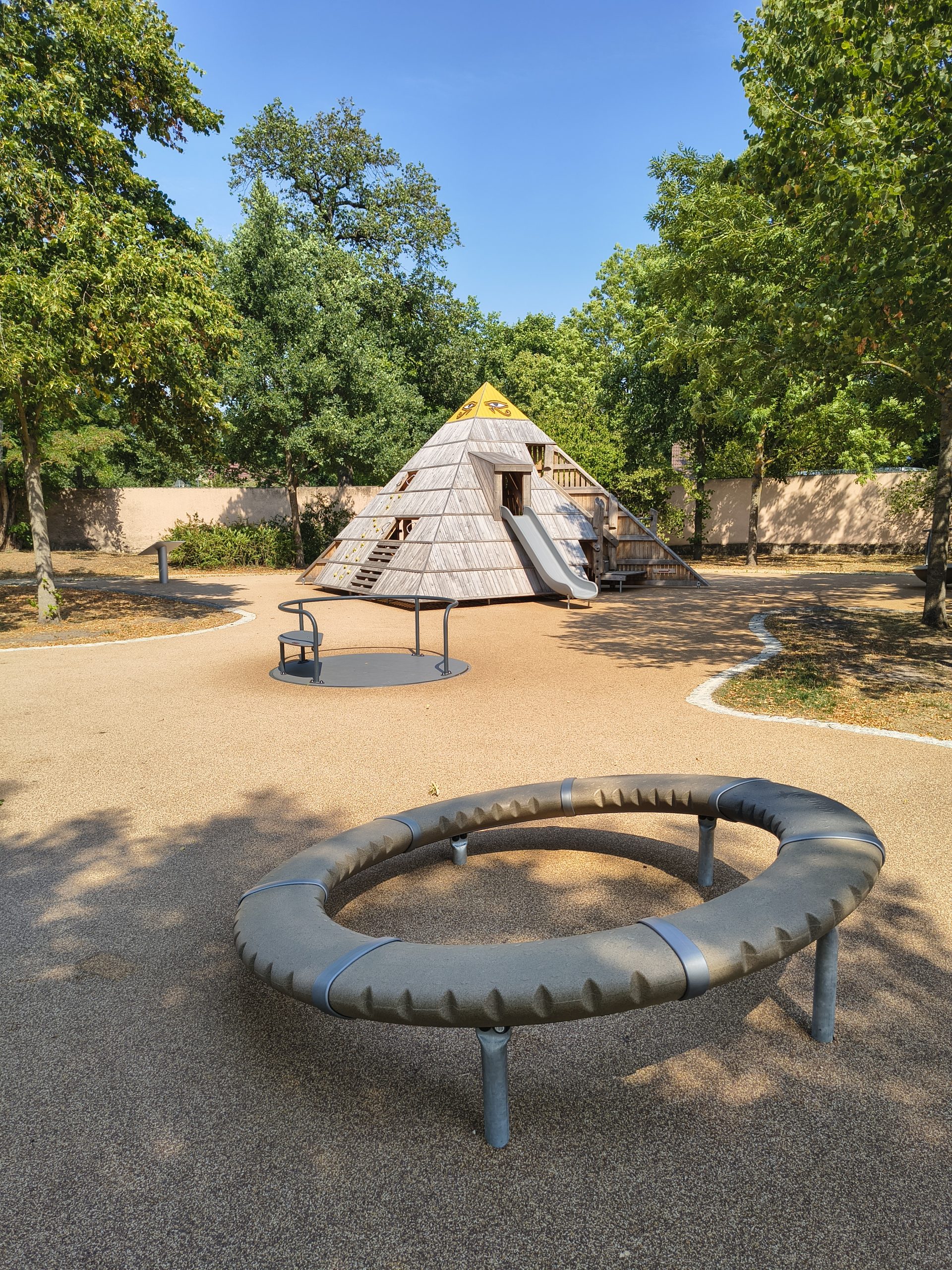 Der Park ist sehr weitläufig, bietet viel Schatten und ist ein herrlicher Park zum Schlendern. Wir besuchten in der Nähe des Schlosses und den inklusiven Spielplatz mit dem Highlight einer großen Kletterpyramide. Es gibt zusätzlich ein Trampolin, ein Karussell und eine Schlangenschaukel.