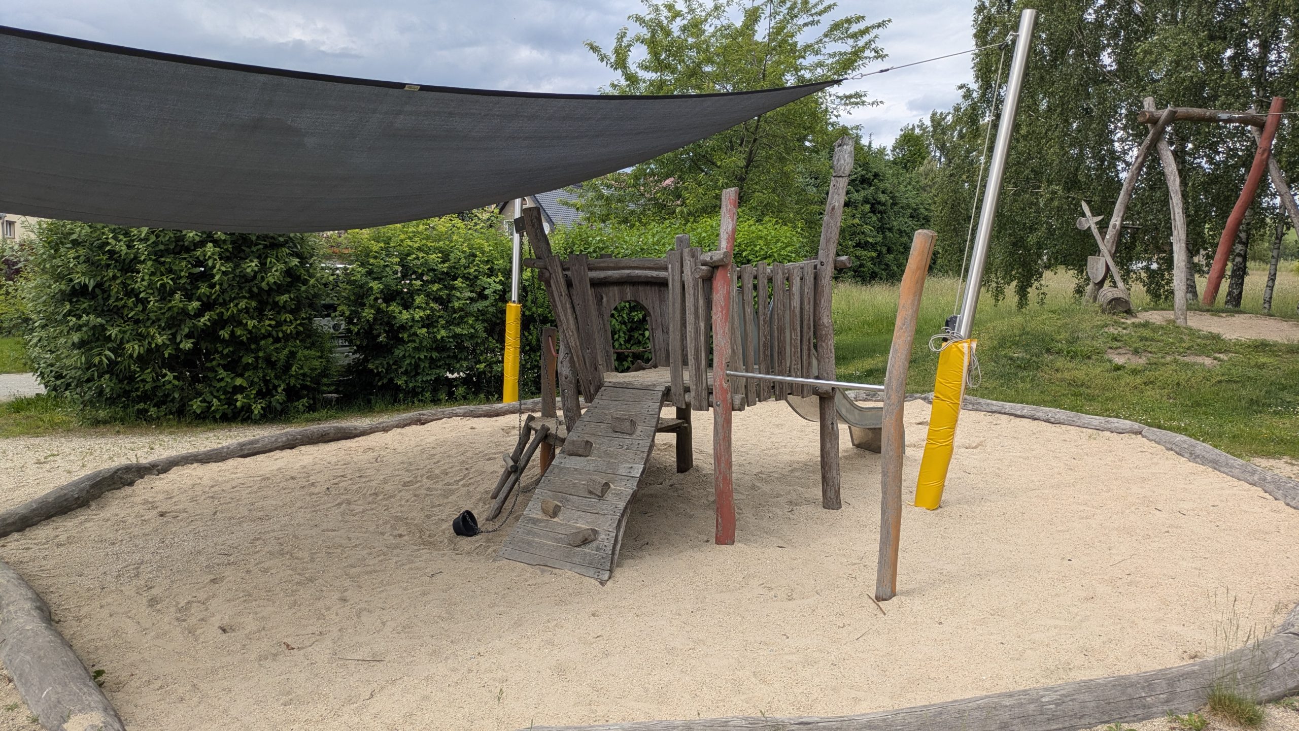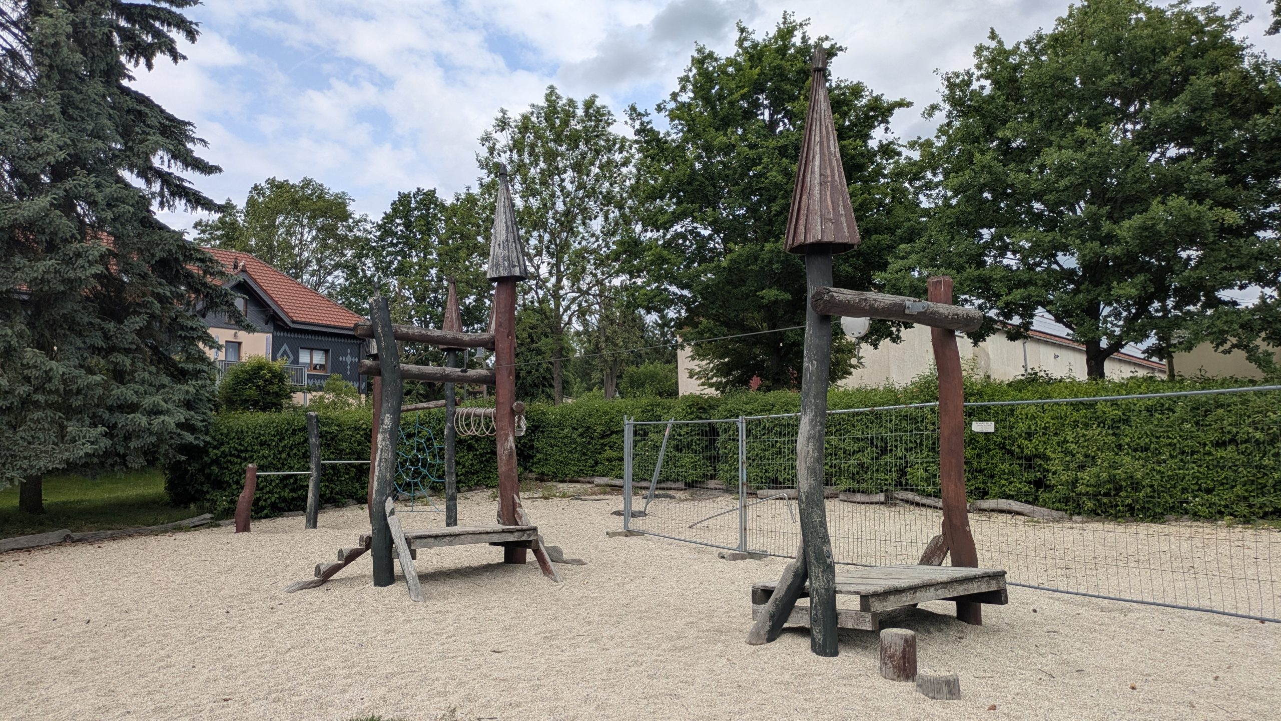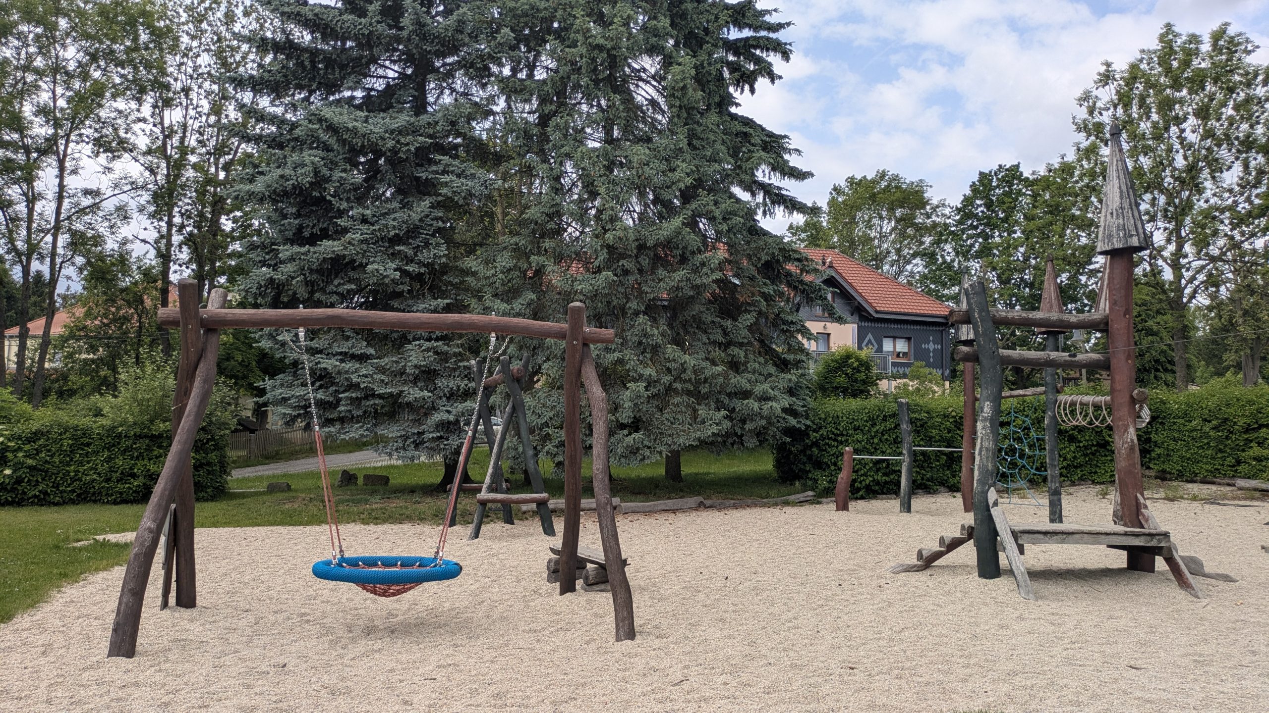 Unmittelbar in der Nähe des Barock- und Schlossparks in Großhartau befindet sich ein kleiner Schlossspielplatz. Zur Zeit unseres Besuchs im Mai 2025 war leider das große Kletterschloss abgebaut.