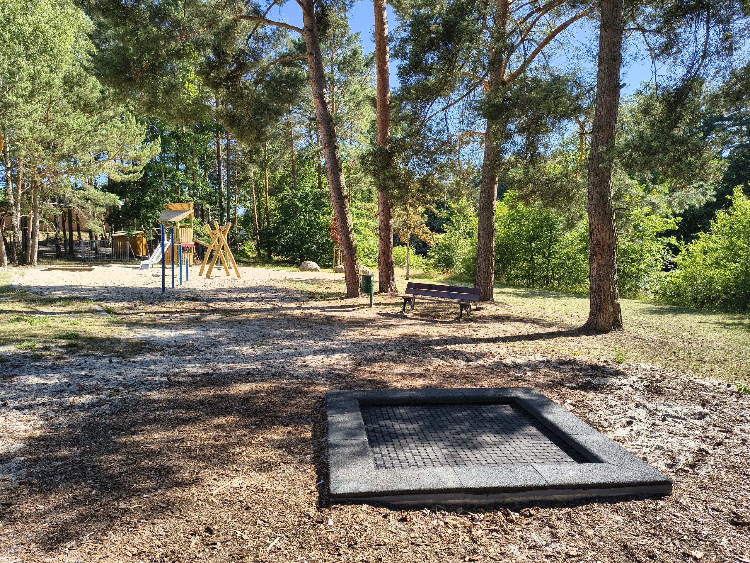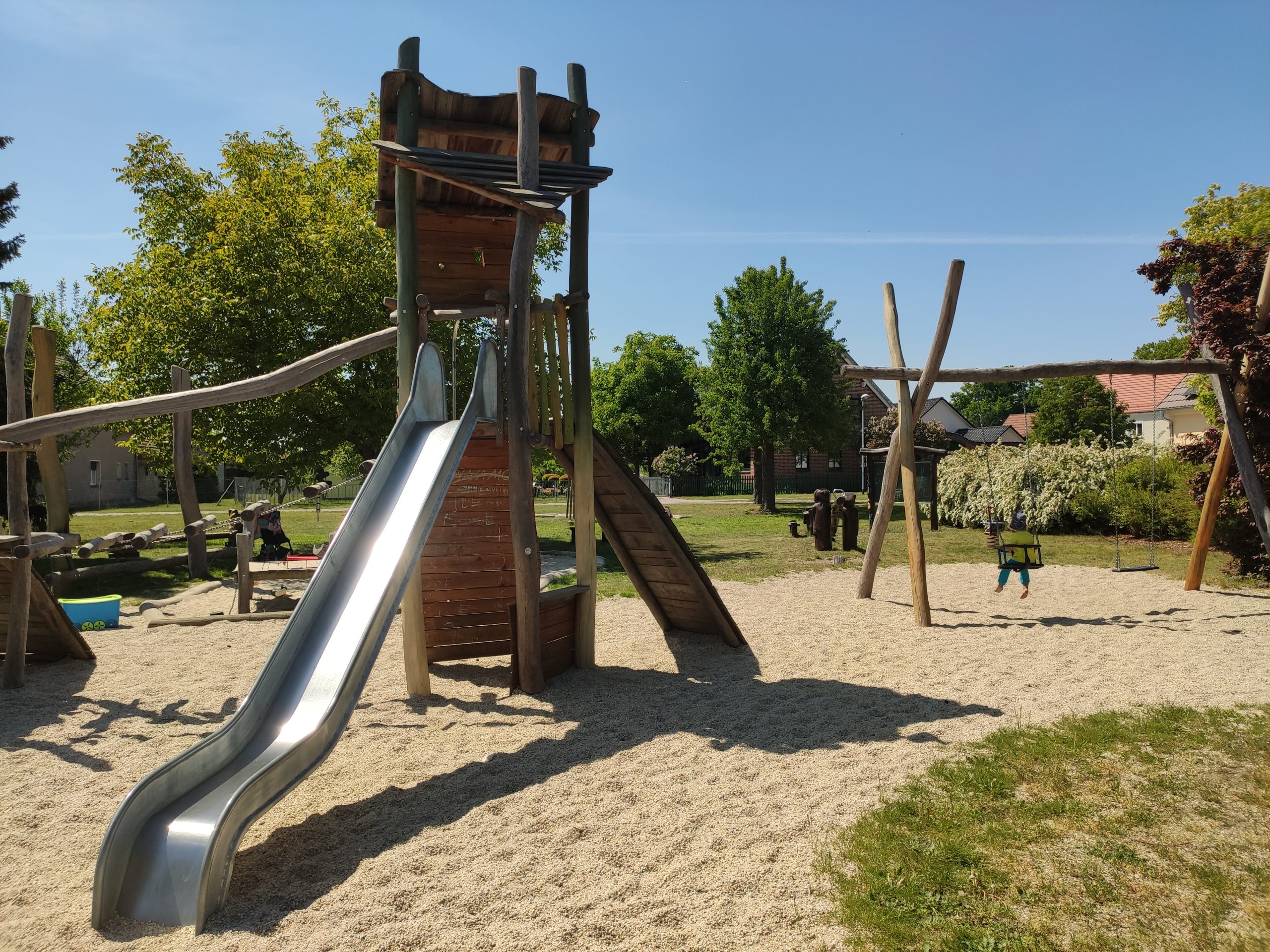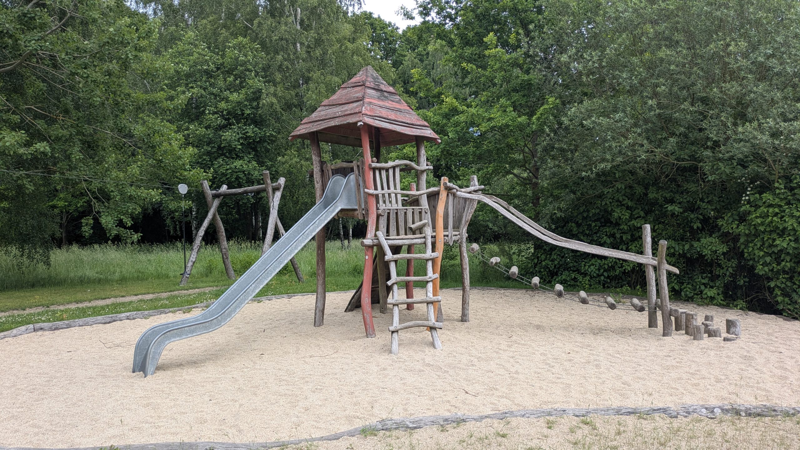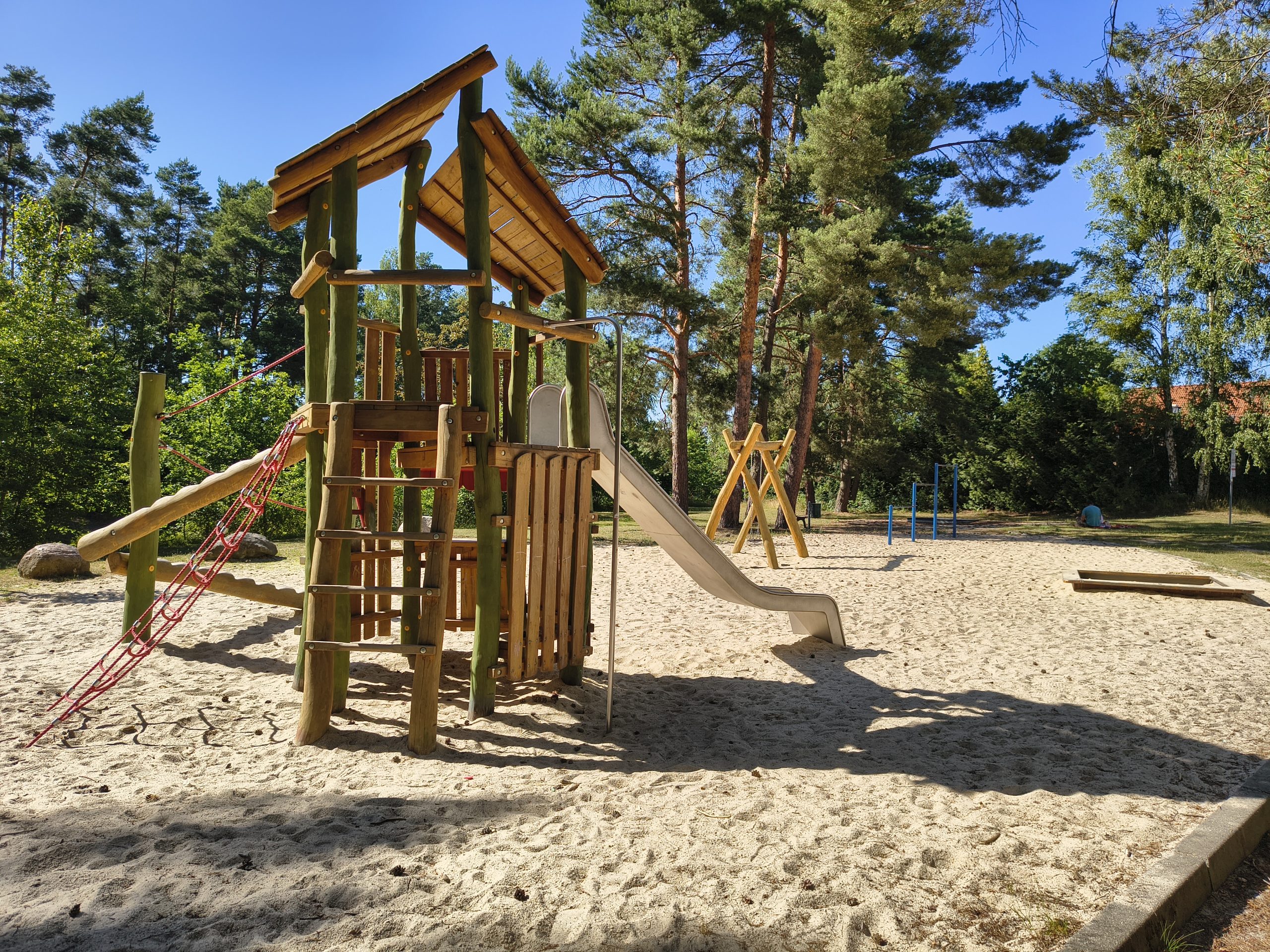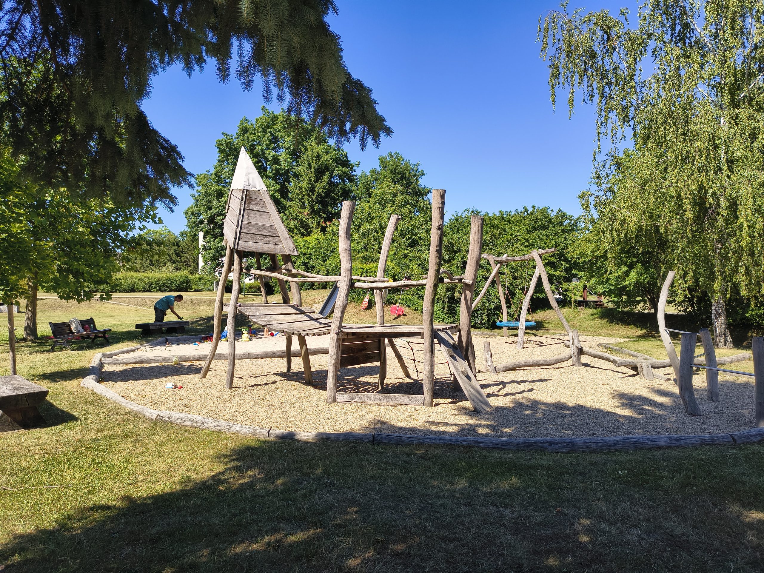 Es gibt einen großen Kletterturm mit Rutsche, Wackelbrücke und verschiedenen Möglichkeiten den Turm zu erklimmen. Zudem gibt es eine lange Zipline, zwei Schaukeln und einen schönen beschatteten Kleinkindbereich mit kleiner Rutsche und Sandspielzeug.