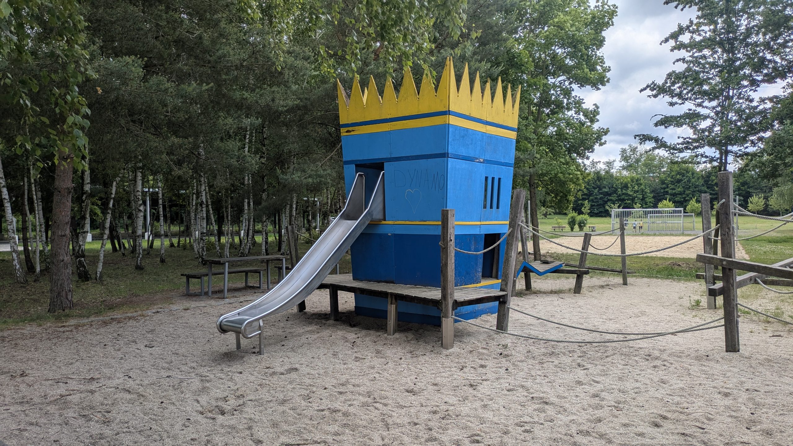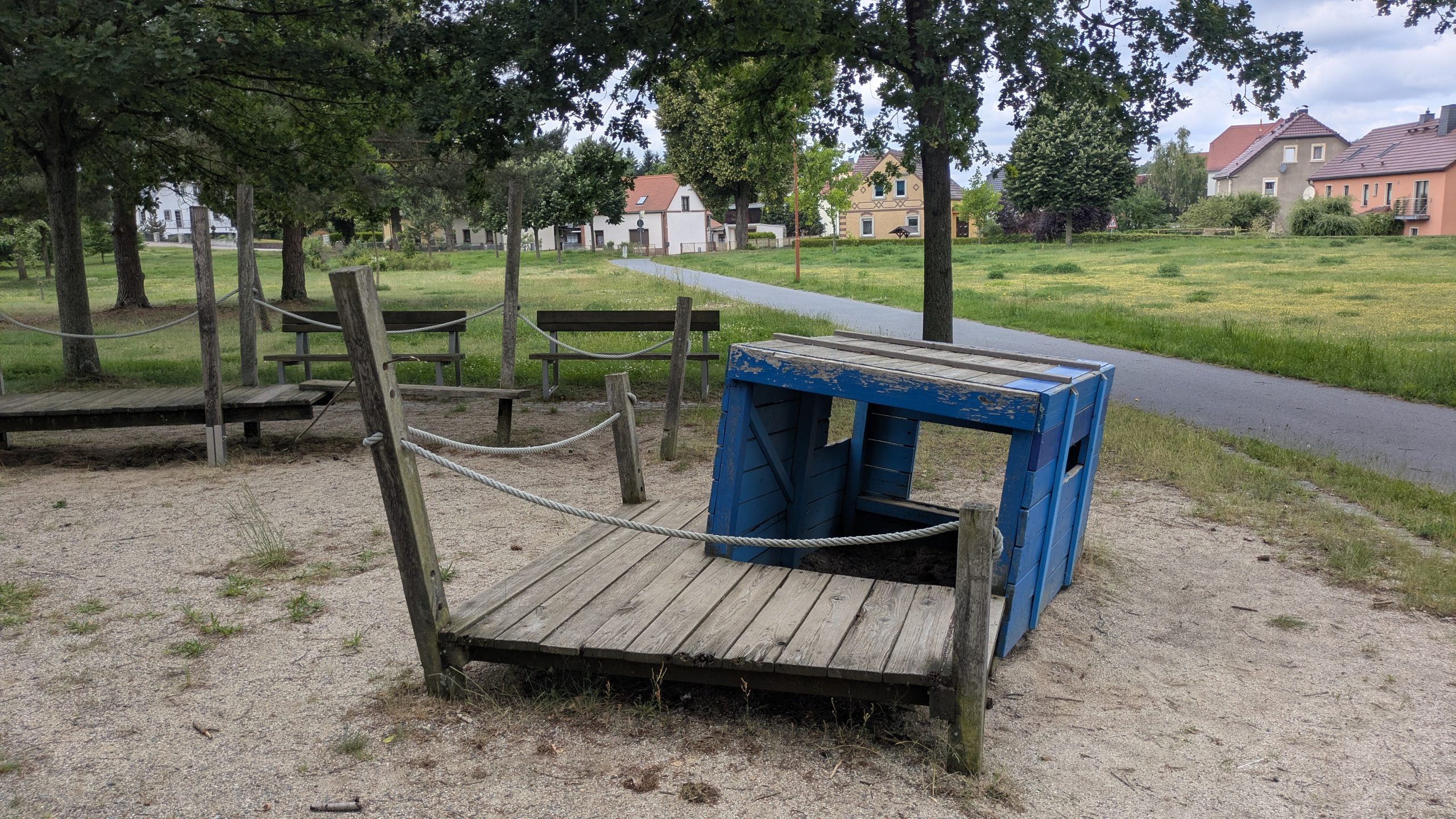 In der Nähe des Stadtparks von Königsbrück befindet sich dieser kleine, aber feine Königspielplatz. Es gibt einen großen Kletterturm mit Rutsche, Balancierbalken, Seilen und einen kleineren Kletterwürfel. Daneben befindet sich ein kleiner Skaterpark mit Halfpipe.