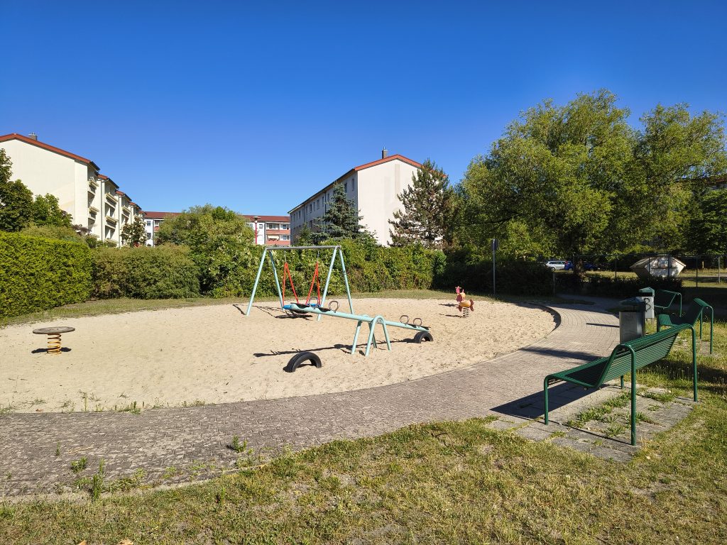 Ebenfalls in der Einsteinstraße befindet sich ein weiterer Spielplatz. Es gibt eine Nestschaukel, drei Wackeltiere und eine Wippe. Ausreichend Bänke sind auch vorhanden.