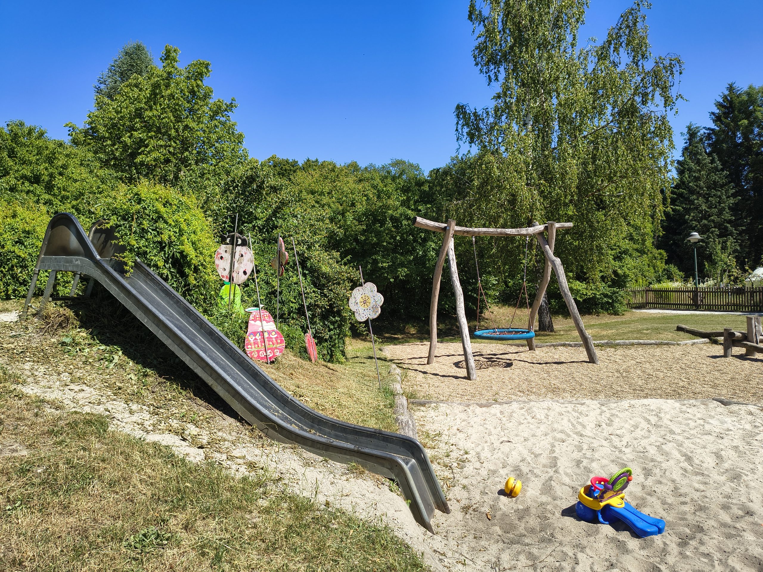 Der Spielplatz bietet viele Klettermöglichkeiten, verkehrte Häuser, eine große Rutsche, mehrere Schaukeln, eine Nestschaukel und ein großes Areal bietet genug Platz zum Rennen und Toben.