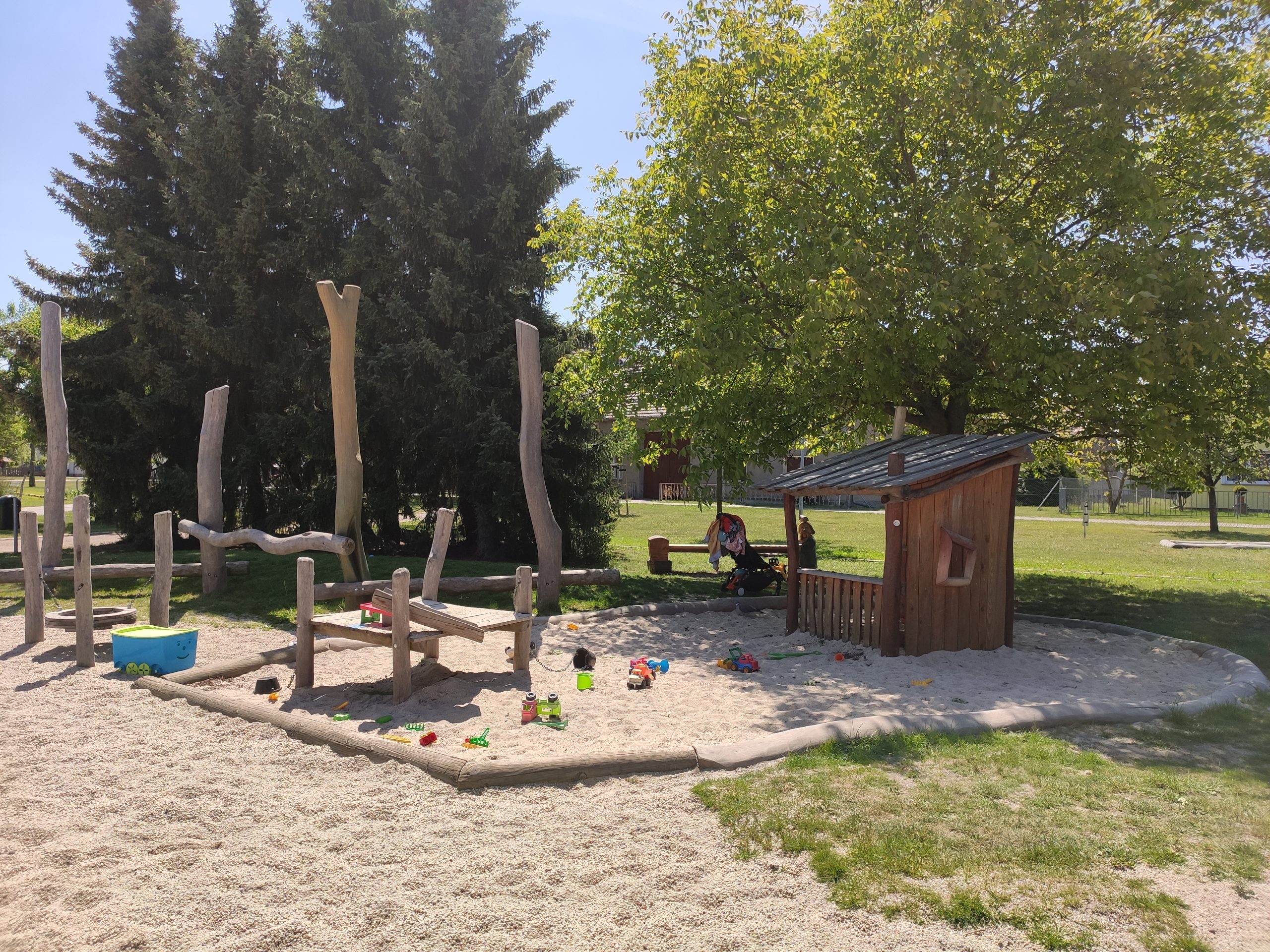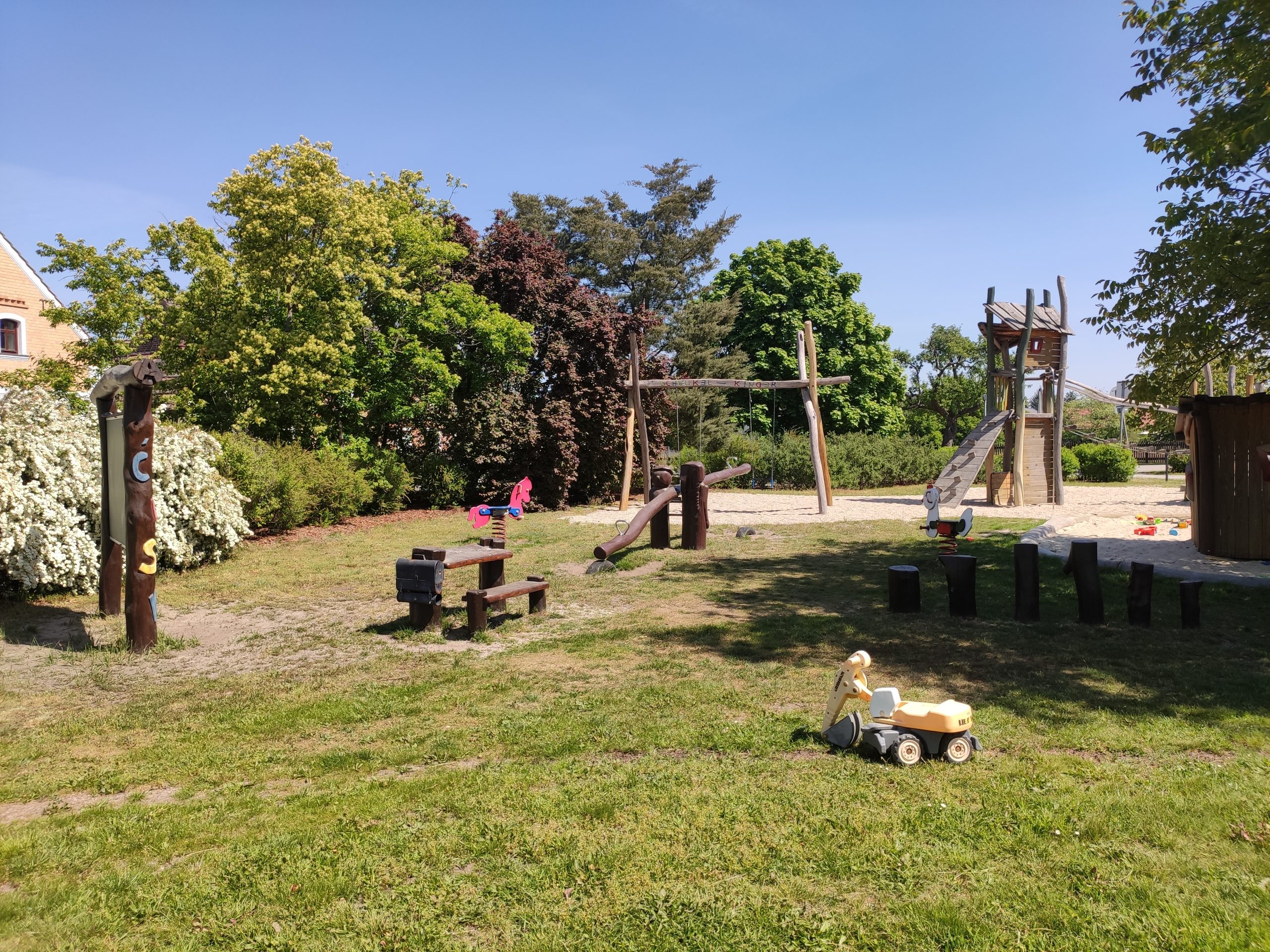 Zudem gibt es ganz viele einzelne Elemente, wie Wippe, Schaufelbagger, Karussell, die Kindern viel Spaß machen. Einen kleinen Kickerplatz gibt es ebenfalls.