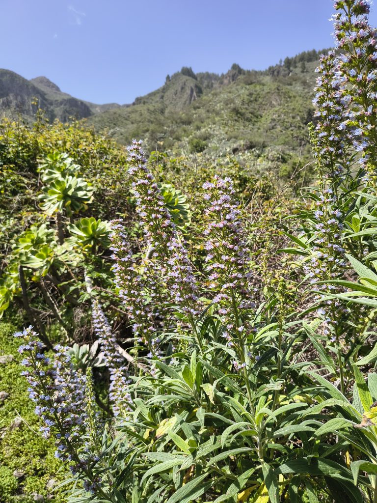 Der Pfad führt vorbei an summenden Bienen, die sich an Riesenhauswurz, der blauen Tajinaste, zwei auf Gran Canaria endemischen Pflanzen, der kanarischen Glockenblume und Maiblume laben.