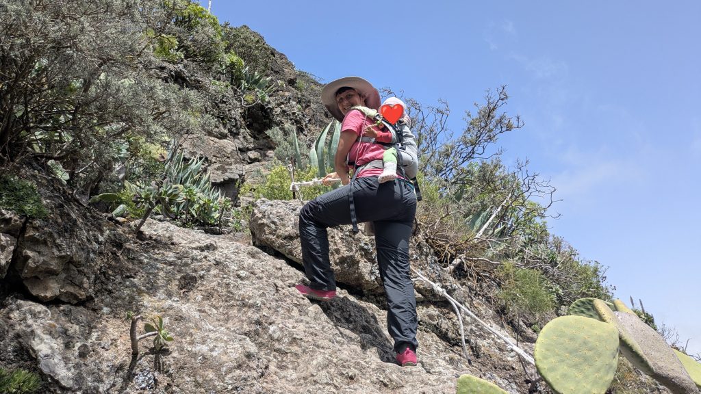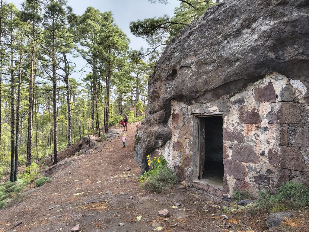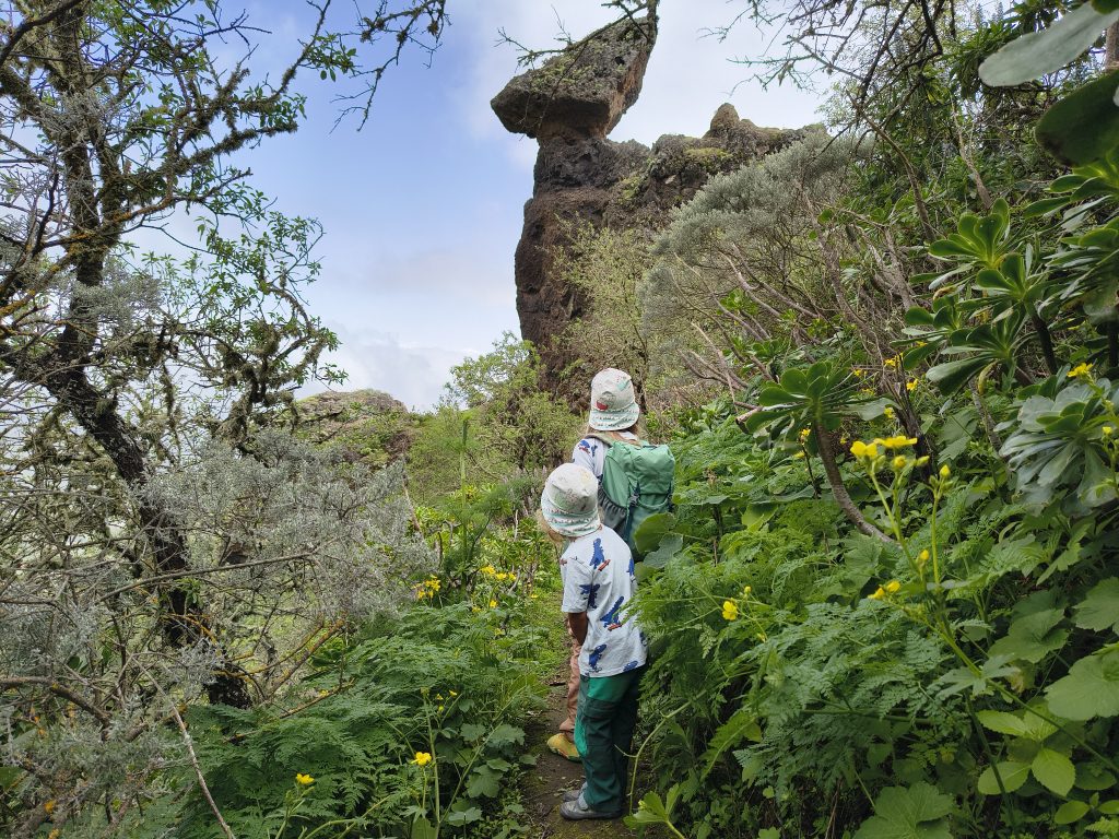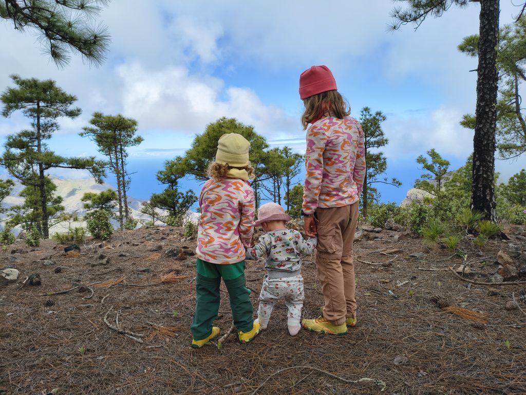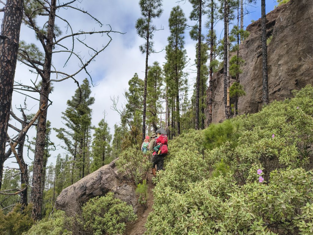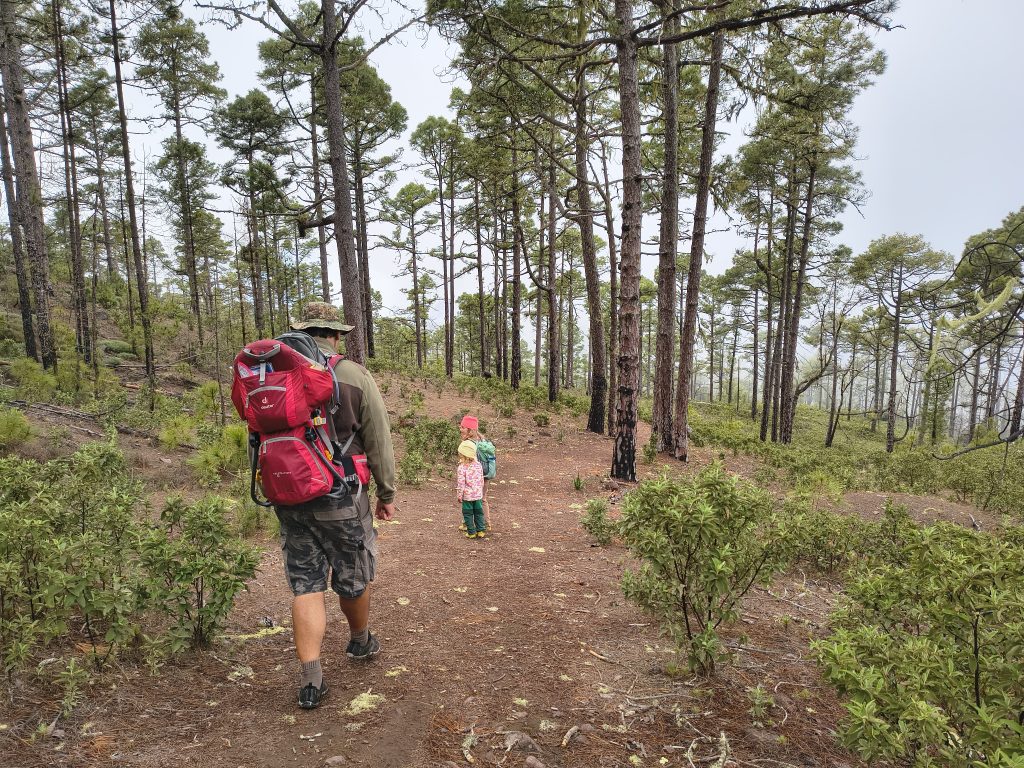 Anschließend führte uns der Weg leicht hinab. Wir liefen weiter durch den kanarischen Fichtenwald. Es gibt unzählige Kletterabenteuer für Kinder. Viele kleine Felsen, ein kleiner Wasserlauf und Pfützen boten viel Spaß für unsere Kleinen.
