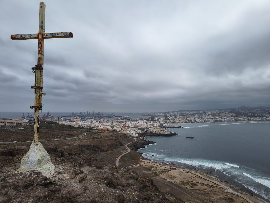 Wir parkten unser Auto im Zentrum des Ortes Las Coloradas und wanderten ca. 10 Minuten den Berg hinauf zum Gipfelkreuz. Von dort hatten wir einen herrlichen Ausblick auf Las Palmas und den Strandabschnitt „Playa del Confital“, den wir anschließend erwandern wollten.