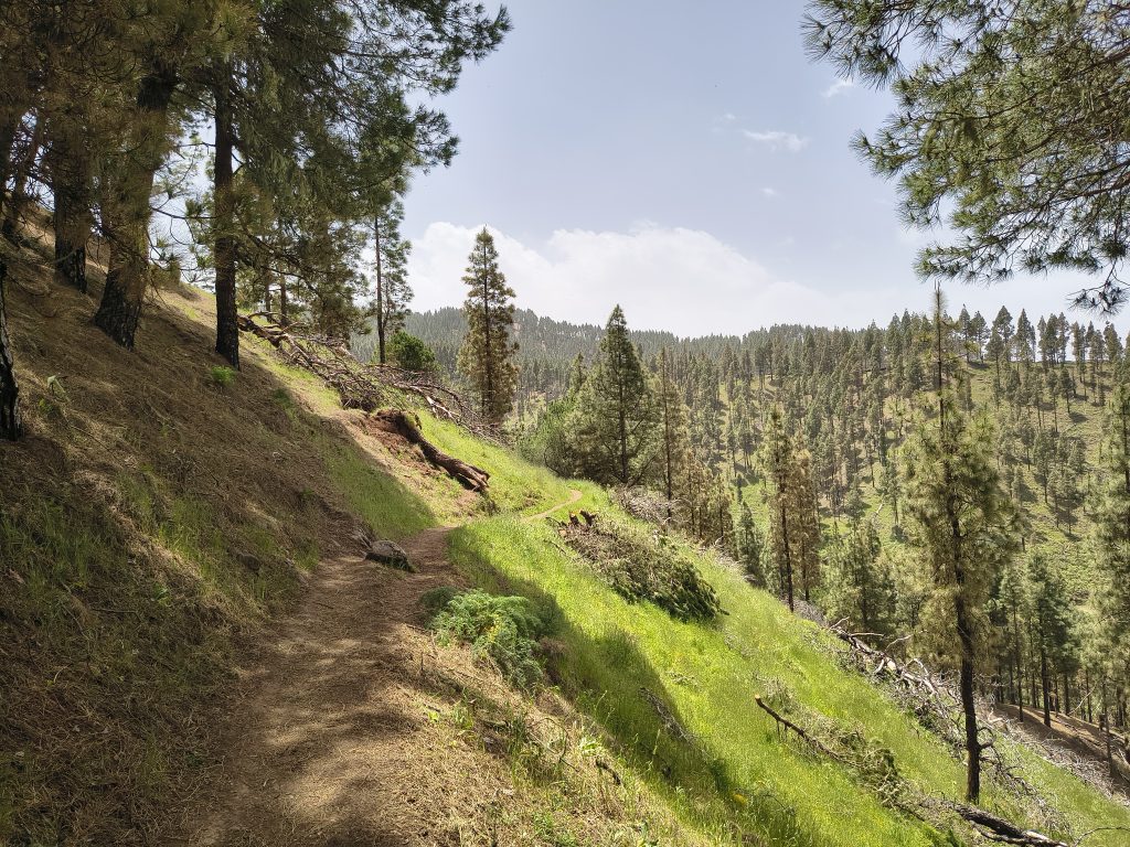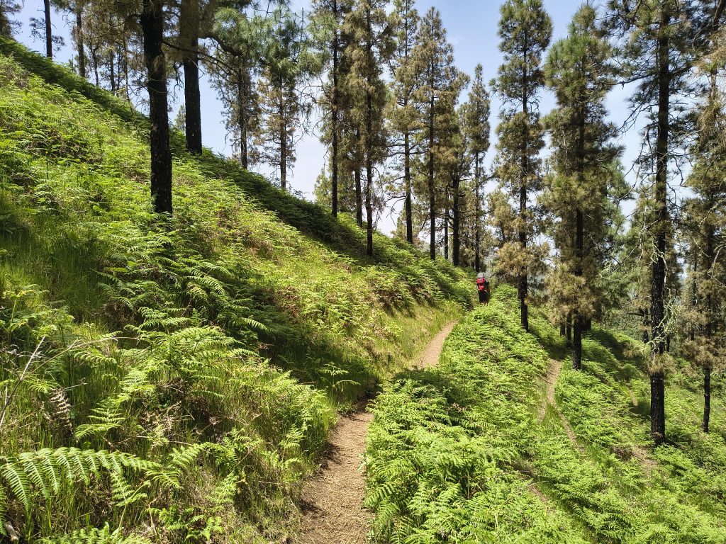 Nachdem wir die sanften grünen Hügel hinter uns gelassen haben, sind wir auf einen herrlichen Wanderweg durch typischen kanarischen Kiefernwald gelaufen.