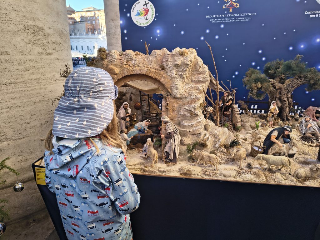 Wir schlenderten über den Petersplatz. Dort gab es sogar einen kleinen Weihnachtsmarkt mit verschiedenen Aufstellern zu Jesu Geburt.